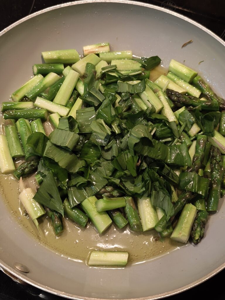 Bärlauch hinzufügen und weitere 3 Minuten auf niedriger bis mittlerer Stufe mitbraten.